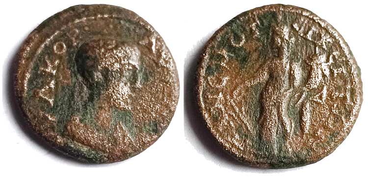 | Aulock Pis. 1137-1138 | Maximinus I. AE19 of Panemoteichos, Pisidia. AD 235-238. 3.94 g. AY K Γ IOY MAXIMIN CE, laureate head right. / ΠANEMOTIXEITΩN, Tyche standing left, holding rudder and cornucopiae. Aulock Pisidien 1 1137-1138; SNG Cop 175; SNG Turkey 2, 91; Watson 460; RPC VI temp 6076. | Text | Image |