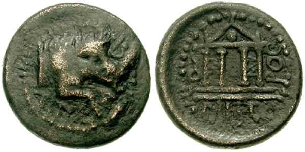 Pisidia, Tityassos. Autonomous. ca 2nd Century AD. AE18mm. Forepart of boar right / Tetrastyle temple, snake to left.