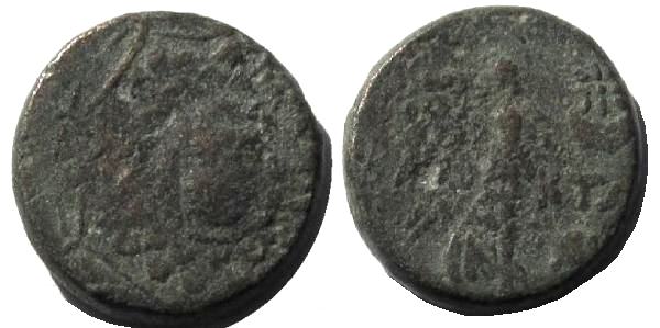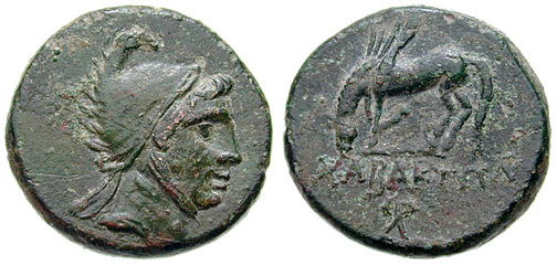 | SNGCop 205 | Pontos, Chabakta. Circa 85-65 BC. AE21mm. Head of Ares right in crested helmet / CABAKTΩN, Sword in sheath. | Text | Image |