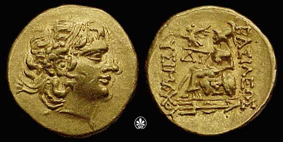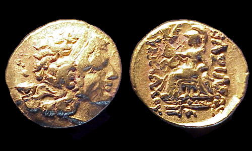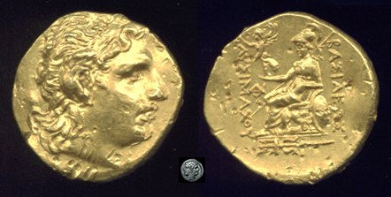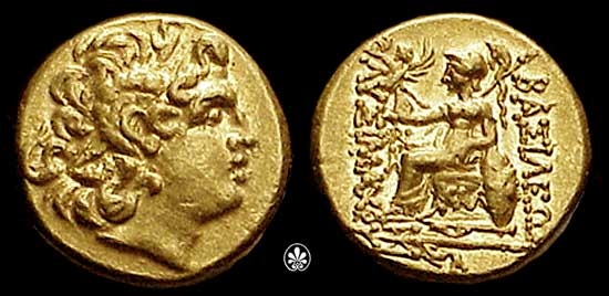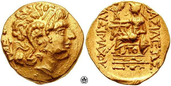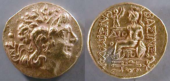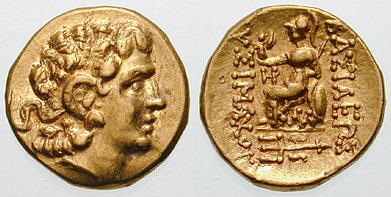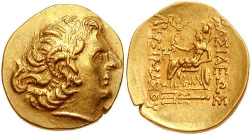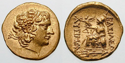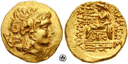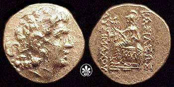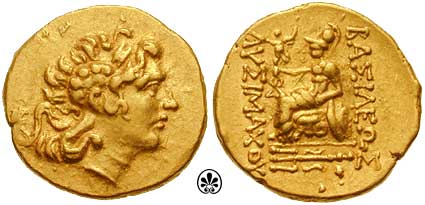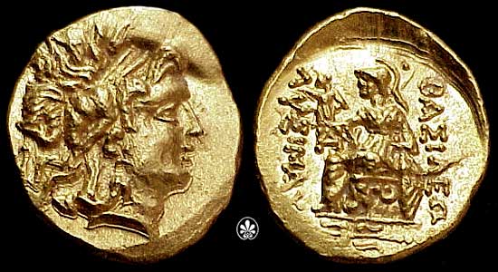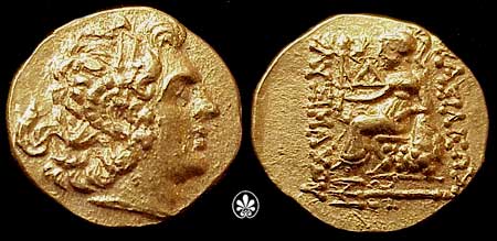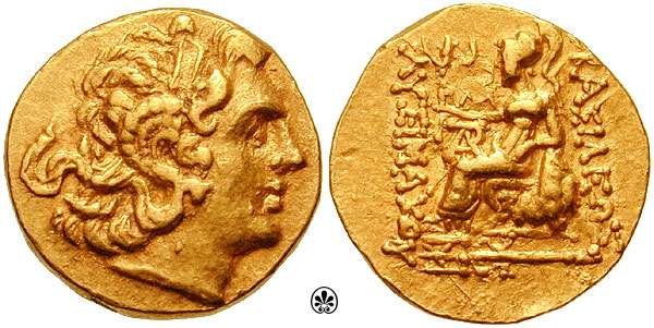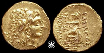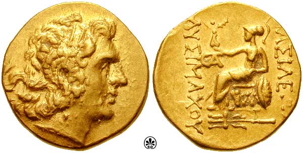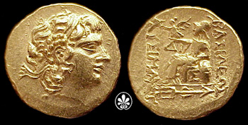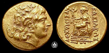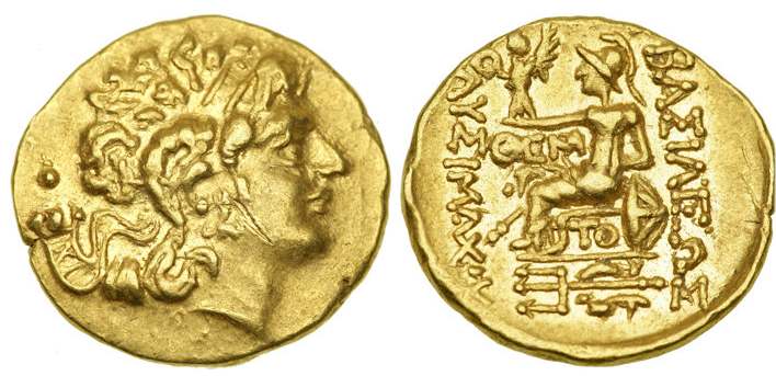 | DeCallatay p142cf | Mithradates VI AV Stater. Byzantium Mint, c. 88-86 BC, Head of Alexander III right with horn of Ammon, decorated with pellets / BAΣIΛEΩΣ ΛYΣIMAXOY, Athena seated left, left elbow resting on shield, holding Nike in extended right hand, _I Y monogram above knee, BY on throne, trident left in exergue. | Text | Image | |