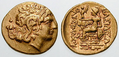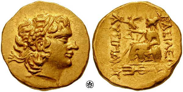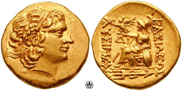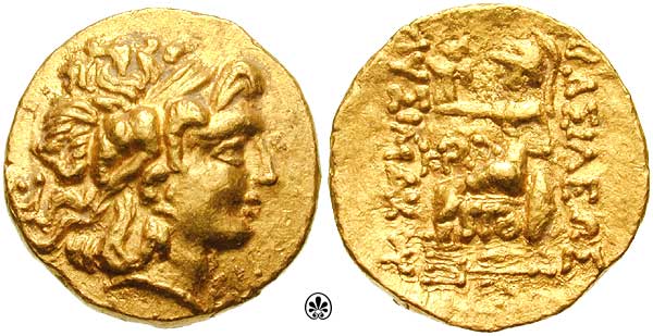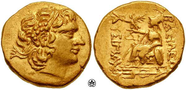 | DeCallatay p005-D7-R2 | Mithradates VI, King of Pontos AV Stater. Pergamon mint, dated Pergamene Era year 2 (88/7 BC). Diademed head right, hair tousled and flowing freely / BAΣIΛEΩΣ MIΘΡAΔATOY EYΠATOΡOΣ, stag grazing left; pellet below, star and crescent to left, B (date) and monogram to right; all within Dionysiac wreath of ivy and fruit. BMC 1v, SNGvA 6676. | Text | Image | |