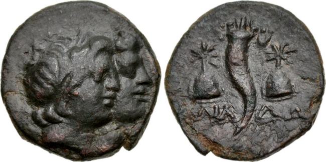 | CNG 84-516 | Black Sea Region, time of Mithradates VI? Uncertain mint. Ca 125-00 BC. AE15mm, 2.91 g. Jugate heads of the Dioskuri right. / AΛIA-ΔΩ to left and right of cornucopiae between the caps of the Dioskuri, each surmounted by a star. Unpublished. | Text | Image | |