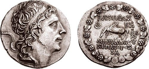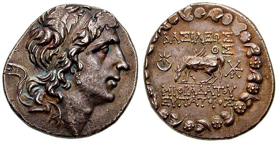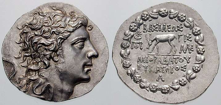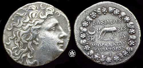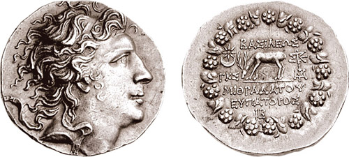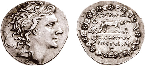 | BMC 4 | Pontic Kingdom, Mithradates VI AR Tetradrachm. Diademed head right / BAΣIΛEΩΣ MIΘΡAΔATOY EYΠATOΡOΣ above and beneath Pegasus grazing left, star in crescent in upper left field, ΡXA monogram to right, all within Dionysiac wreath of ivy leaves and fruit. | Text | Image | |