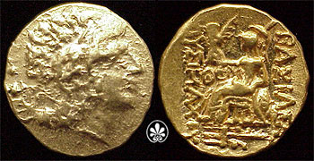 | AMNG 258 | Mithradates VI of Pontos, AV Stater. Time of the First Mithradatic War, Struck in the name of Lysimachos. 88-86 BC. Kallatis mint. Diademed head of the deified Alexander the Great right with horn of Ammon / BAΣIΛEΩΣ ΛYΣIMAXOY, Athena seated left, left elbow resting on shield, holding Nike in extended right hand; monogram above knee, KAΛ on throne, trident in ex. | Text | Image | |
