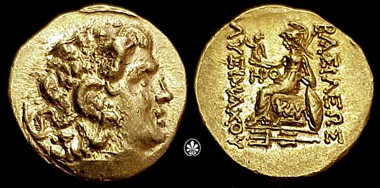 | DeCallatay p141v | Mithradates VI, King of Pontos AV Stater. Time of First Mithradatic War, 88-86 BC. Tomis Mint. Diademed head of deified Alexander III right with horn of Ammon; small dot above large dot behind / BAΣIΛEΩΣ ΛYΣIMAXOY, Athena seated left, Nike standing left in Athena's extended right hand, Athena's left elbow resting on shield; TO on throne, ΔIO above knee, trident in ex. | Text | Image | |