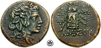 | SNG BS 1209 | Mithradates VI, c85-65 BC, AE23mm of Pontos, Amisos. Head of Mithradates as Dionysos wreathed in ivy right / AMIΣOY, Cista mystica, on which panther skin is draped; thrysus to left, monograms to left and right. | Text | Image | |