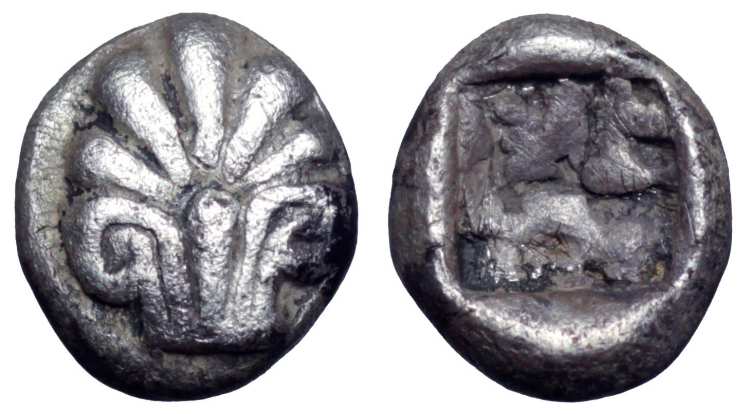 | SNG Cop 337 | Ialysos, Rhodes, Caria. AR diobol, ca 540-530 BC. 9 mm, 1.02 g. Palmette. / Rough incuse square punch. SNG Cop 337; Hoover HGC 1368; HNO Caria 1956. | Text | Image |