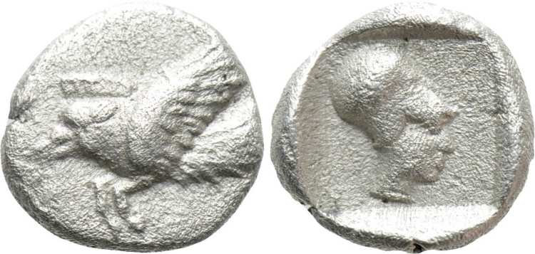 | wwxls AR13206 | Ialysos, Rhodes, Caria. AR trihemiobol, ca 520-480 BC. 11 mm, 1.1 g. Forepart of winged boar right. / Eagle's head right within plain incuse square. Traces of IAΛYΣION below. wwxls AR13206; Savoca 7, 442. | Text | Image |