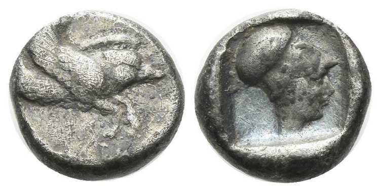 | SNG vA 2778 | Ialysos, Rhodes, Caria. AR diobol, ca 480-408 BC 9 mm, 1.36 g. Forepart of winged boar right. / Helmeted head of Athena right, wearing Corinthian helmet, within incuse square. SNG von Aulock 2778; Hoover HGC 1375; SNG Keckman 303-305; HN online 367. | Text | Image |
