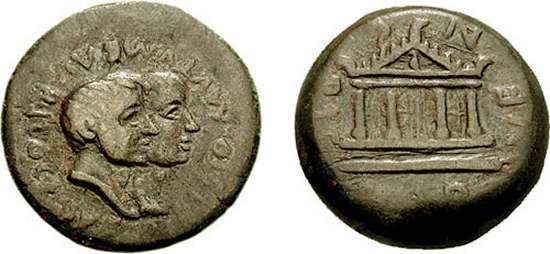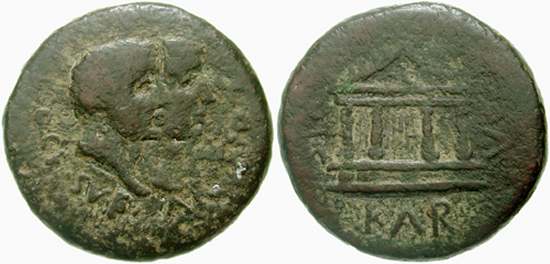| RPC_624 | Sardinia, Caralis AE30mm. ca 40 BC. Aristo & Mutumbal Ricoce, suffetes. ARISTO MVTVM BAL RICOCE SVF, conjoined male heads right / VENERIS, KAR in exergue, tetrastyle temple of Venus, dove in pediment. FITA 149-150. | Text | Image | Text | Image |