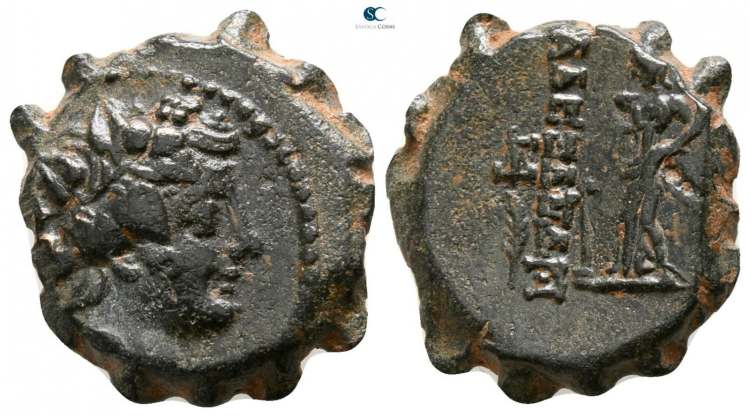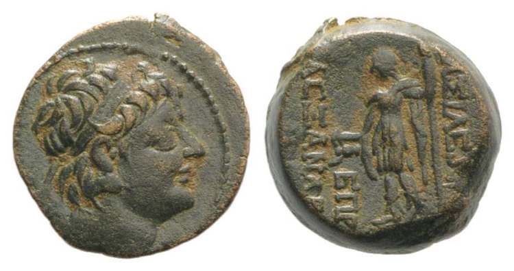 Hoover 1161 | Alexander II, Seleukid Kingdom, AE19, 129-123 BC. Antioch ad Orontem mint. Dated 129-128 BC. 5.88 g. Diademed head of king right / BAΣIΛEΩΣ AΛEXANΔΡOY and date ΔΠΡ to left and right of Dionysos, wearing chiton and boots, standing left, holding kantharos and thyrsos. SNG Newcastle 627-628; Hoover HGC 1161; SC 2229; Houghton Collection 299. | Text | Image |