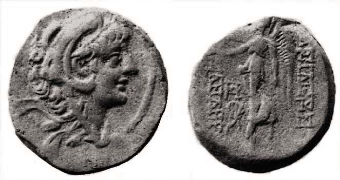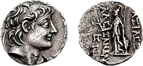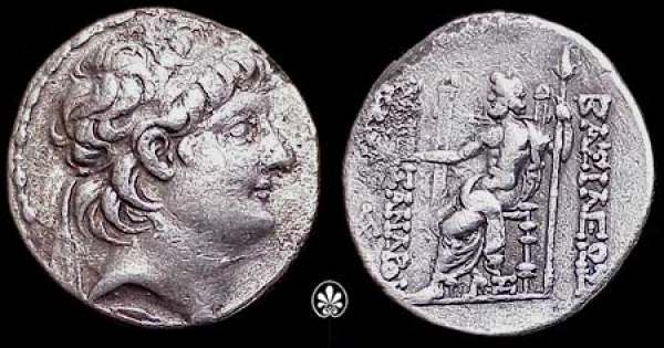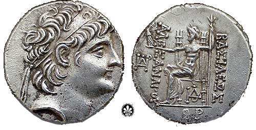 SNG Is 2280 | Seleukid Kingdom, Alexander II AR Tetradrachm. Antioch mint. Diademed head right / BAΣIΛEΩΣ AΛEXANΔΡOY to right and left, Zeus seated left, holding Nike in right hand, lotus-tipped sceptre in left; IΣI to left, star and monogram under throne. | Text | Image |