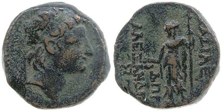 Babelon Rois, 1300 | Alexander II Zabinas. AE21. 128-122 BC. Antioch mint. 6.5 g. Radiate head of king right. / BAΣIΛEΩΣ AΛEXANΔΡOY to right and left of Athena standing left, holding Nike and spear, shield at her side. YE monogram over corn ear in left field. Babelon Rois, 1300; SNG Spaer 2305; BMC 17 var (monogram over aplustre). Hoover HGC 1163; Houghton SC 2233. | Text | Image |