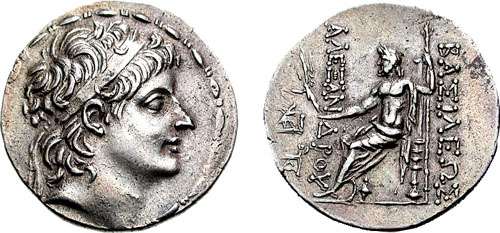 Sear 7115 | Alexander II Zabinas, Seleukid Kingdom,. 128-123 BC. Silver Tetradrachm. Diademed head right / BAΣIΛEΩΣ AΛEXANΔΡOY, Zeus seated left, holding Nike. | Text | Image |