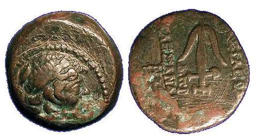 BMC 31 | Alexander II Zabinas, Seleukid kingdom, 128-123 BC. AE16. Prow of ship right, the two pilei of the Dioskuri surmounted by stars above / BAΣIΛEΩΣ AΛEXANΔΡOY to right and left of tripod lebes, two palm branches and urn in the lebes, A and star to left, Π to right. Hoover 1176; BMC 31; SC 2238e. | Text | Image |