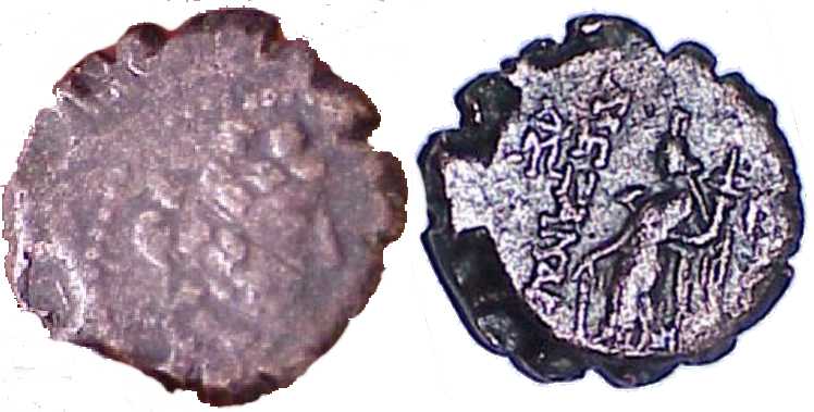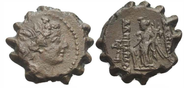 Hoover 1166 | Alexander II Zabinas. AE18 Serrate. Seleukeia, Syria mint. 128-122 BC. Apameia ad Axios mint (?). Head of young Dionysos right, wreathed with ivy / BAΣIΛEΩΣ AΛEXANΔΡOY, Tyche, winged, standing left, wearing kalathos, holding rudder and cornucopiae. No monogram or symbol. Mionnet V, 748; SC 2242; Hoover 1166. | Text | Image |