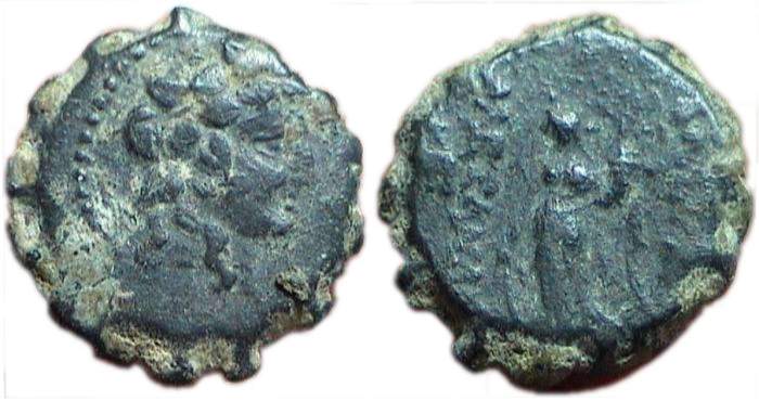 SC 2239b | Alexander II Zabinas, Seleukid kingdom, AE19, 6.33 g. 128-123 BC. Seleukeia, Syria mint. Laureate head of Zeus right. / BAΣIΛEΩΣ AΛEXANΔΡOY EΠIΦANOYΣ NIKHΦOΡOΣ in four lines above and beneath thunderbolt. N in left field, all within laurel wreath. SC 2239b; Hoover HGC 1165; Houghton 413; Babelon Rois 886 ("Alexander I Bala"). | Text | Image |