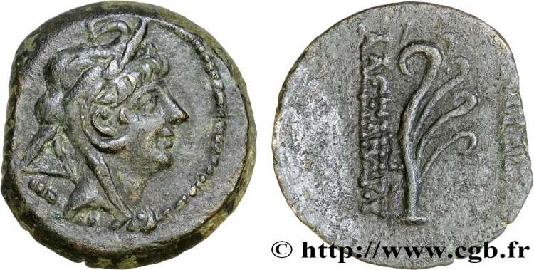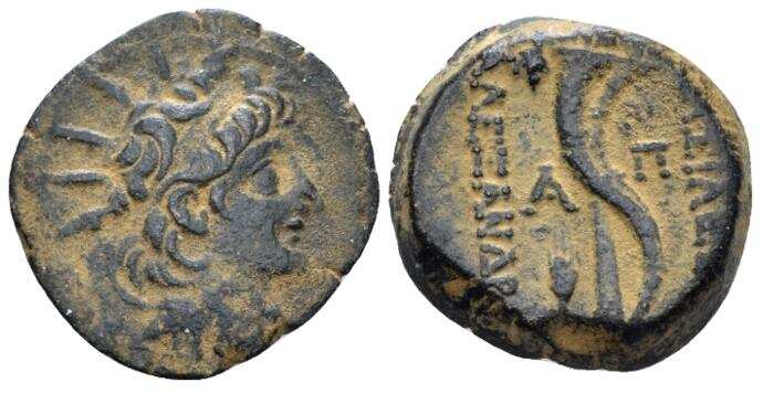 SNG Is. 2309 | Alexander II Zabinas, Seleukid Kingdom. AE16. 128-122 BC. Antioch ad Orontem mint. 3.13 g. Head of king right, wearing elephant-skin headdress. / BAΣIΛEΩΣ AΛEXANΔΡOY, aphlaston, RE monogram above grain ear in inner left field. SNG Is. 2309; SC 2234.1c; Hoover HGC 1173; (type BMC 11). | Text | Image |