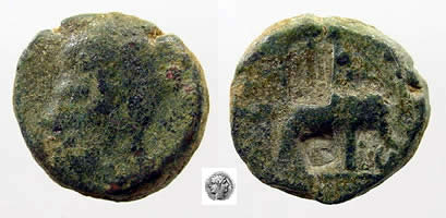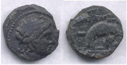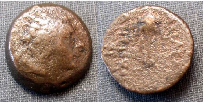 Houghton 979 | Antiochos III AE 12mm, Denomination D. Sardes mint. Laureate head of Apollo right / BAΣIΛEΩΣ above, ANTIOXOY below, elephant walking left; upturned anchor before. Newell WSM 1114; SNGIs 615. | Text | Image |