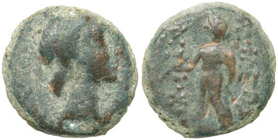SNG Is 583 | Antiochus III, AE 12, Apollo standing left, examining arrow, bow behind. | Text | Image |