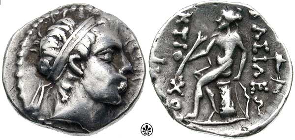 SNG Is 650 | Antiochus III AR Drachm, Tarsus mint. Diademed head of Seleukos III right / BAΣIΛEΩΣ ANTIOXOY either side of naked Apollo seated left on omphalos holding arrow & leaning on bow, monogram left, NK right. | Text | Image |
