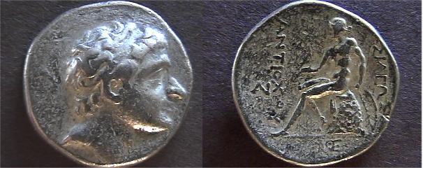 Houghton 999•2 | Seleukid Kingdom, Antiochos III AR Tetradrachm. Uncertain mint in Phrygia, perhaps Apamea, struck 223/2 BC. Diademed head of Seleukos III right / BAΣIΛEΩΣ ANTIOXOY, Apollo seated left on omphalos, nude but for slight drapery on right thigh, holding arrow in right hand, left hand resting on bow; monogram to outer left. Newell 1696. | Text | Image |