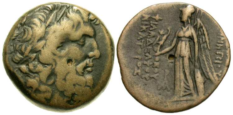 | Houghton 291 | Demetrius II AE14. Antioch mint. Laureate head of Zeus right / BAΣIΛEΩΣ ΔHMHTΡIOY ΘEOY NIKATOΡOΣ, Nike standing left, holding wreath and palm branch. | Text | ![]() |