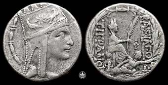 | Bedoukian 19 | Tigranes II. 95-56 BC. AR Tetradrachm (14.79 gm). Antioch mint. Bust of Tigranes; star and two birds on tiara / BAΣIΛEΩΣ TIΓΡANOΣ, Tyche of Antioch seated right, holding palm branch, river-god Orontes swimming right below; PT monogram on rock below Tyche, T in right field. AC 030; Bedoukian 19. | Text | Image |