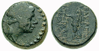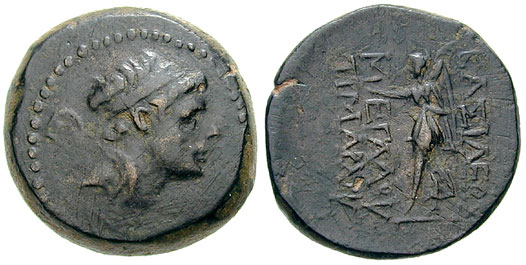 | Houghton 1236 | Seleukid Kingdom, Timarchos, Usurper in Babylon, AE 16mm. Babylon mint, 162 BC. Diademed head of Timarchos right / BAΣIΛEΩΣ MEΓAΛOY TIMAΡXOY, Nike walking left, holding wreath and palm. SNG Spaer 1393; Houghton, CSE, 1236; SNG Copenhagen 249; Le Rider, Suse, pl. lxv, 17. | Text | Image |