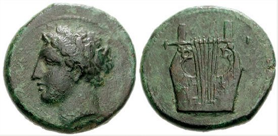 | Calciati 5 | Ameselon, Sicily, AE21, Litra, after 336 BC. 6.95 g. Laureate head of Apollo left / Lyre with seven strings. Calciati 5. | Text | Image |