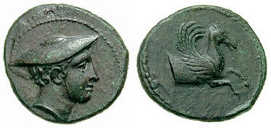 | Cammarota M | Ameselon, Sicily. ca 357-340 BC. AE Hemilitron. Head of Hermes right in petasos, tied under chin / Forepart of Pegasos right. | Text | Image |
