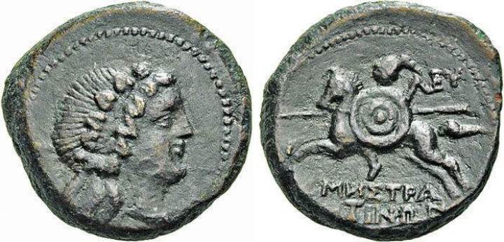 | BMC 1 | Amestratos, Sicily. AE17. ca. 241 BC. 5.32 g. Youthful head of Dionysos right, wreathed with ivy. / ΛEY AMHΣTΡA-TINΩN, helmeted horseman galloping left, holding large round shield and horizontal spear. Calciati, I, 2; BMC 1; Weber 1236; Sear Greece 1057; Hoover HGC 228. | Text | Image |