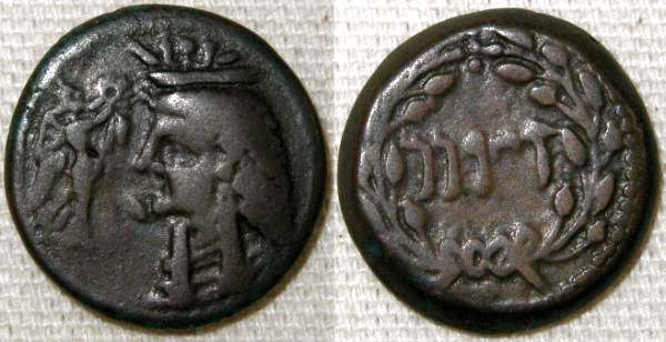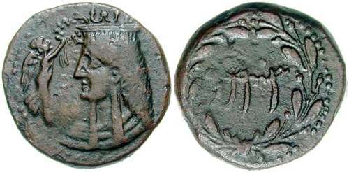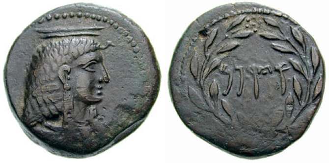 | Calciati 3 | Cossura, Island off Sicily, AE23, Late 3rd to early 2nd Century BC. 12.18 g. Head of Isis right, wearing klaft and necklace. / Punic 'YRNM' within wreath. Calciati 3; Virzi 2151 (this coin); SNG Cop 447; SNG Morcom 940; SNRIS 1. | Text |  |