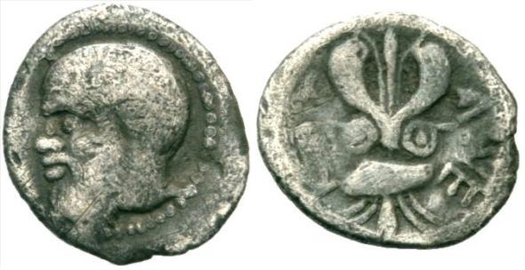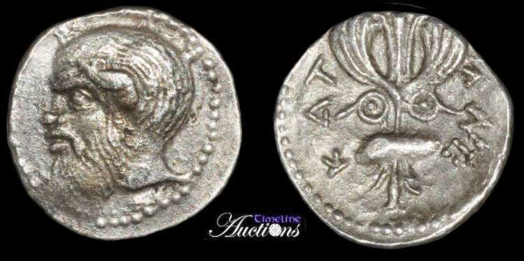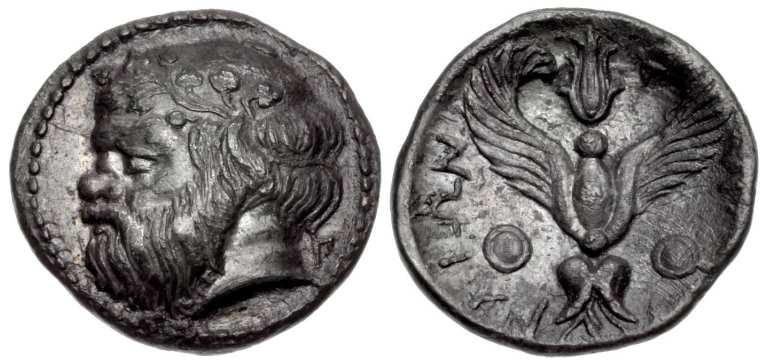 | BMC 9 | Katane, Sicily Litra, 461-450 BC. 12mm, 0.75 gr. Bearded and horned head of Silenos right, wearing ivy wreath / KATANE, thunderbolt with curled wings, shield to left and right. BMC 9; SNG ANS 1237; Hoover HGC 589; Boehringer 1982, Li 5. | Text | ![]() |