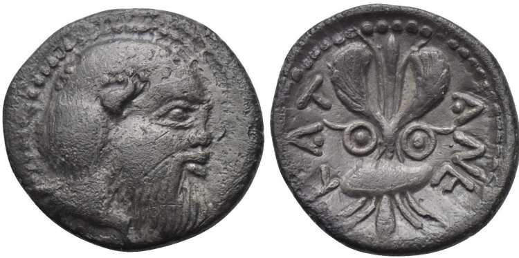 | SNG Lloyd 910 | Katane, Sicily. ca 410 BC. Obverse and reverse dies signed by the artist Choirion. AR Drachm. AMENANOS above, three-quarters facing head of the river-god Amenanos, turned slightly left; crayfish left, two fish right, signature XOI below / KATANAIΩN right, Athena, holding large round shield and spear, driving galloping quadriga left; Nike flying above crowning Athena, maeander pattern below, signature COIRIWN in ex. | Text | ![]() |