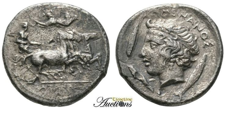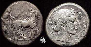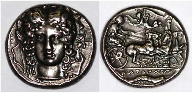 | SNG ANS 1263 | Katane, Sicily, AR Drachm. 405-402 BC. Engraver Euainetos. KATANAIΩN beneath fast quadriga right, the driver crowned by Nike flying left above / AMENANOΣ above horned head of Amenanos left, hair bound in a taenia. Trace of signature EYA below. Hoover HGC 581; SNG ANS 1263. | Text | ![]() |