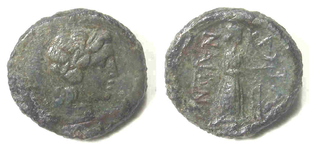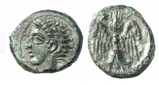 | SNG Cop 193 | Katane, Sicily. AE15. 3rd century BC. Wreathed head of Apollo right / KATA-NAIΩN, Isis standing right holding bird. | Text | ![]() |