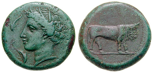 | Calciati 3 | Katane, Sicily. Circa 360 BC. AE Dilitron. Wreathed head of Persephone left, in single-pendant earring and necklace, two dolphins before / Man-headed bull standing right. | Text | ![]() |