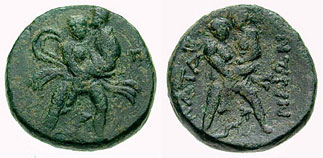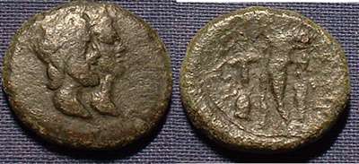 | SNG Cop 198 | Katane, Sicily. AE16. 3rd-2nd century BC. One of the Catanaean brothers, carrying his father / KATANAION, the other brother carrying the mother. SNG ANS 1290. | Text | ![]() |