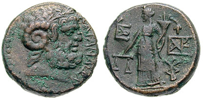 | Calciati 17 | Katane, Sicily. After 212 BC. AE 21mm. KATANAIΩN, laureate head of Zeus Ammon right / Dikaiosyne (Aequitas), standing left, holding scales and cornucopiae, monogram left, two monograms right. Calciati 17; BMC 82; SNG Cop 203. | Text | ![]() |