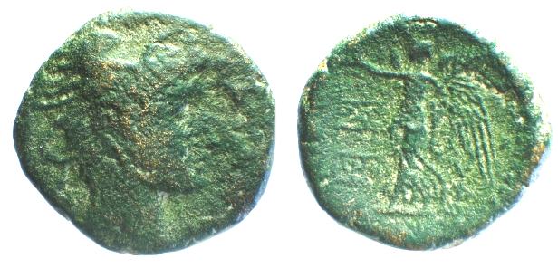 | Calciati 18 | Katane, Sicily, AE20. 413-212 BC. KATAINON, Head of Hermes right, wearing petasos / Nike advancing left, holding wreath and palm branch. SNG ANS 1235. | Text | ![]() |