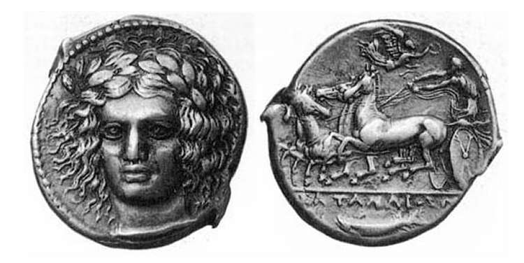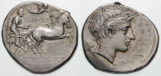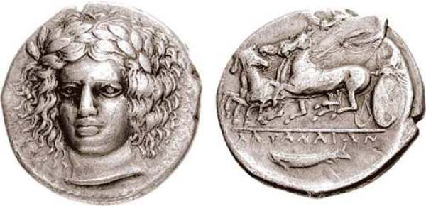 | Hoover 577 | Katane, Sicily, AR tetradrachm, 405-404 BC. Artist Herakleidas. head of Apollo facing slightly left, HΡAKΛEIΔAΣ down right field / Charioteer driving quadriga galloping left, Nike flying right above, crowning the charioteer, KATANAIΩN and fish in exergue. Gulbenkian 190-191; SNG Manchester 382; SNG Blackburn 147; Jameson 545; Kraay 842; SNG Lloyd 902; Hoover Sicily 577. | Text | ![]() |