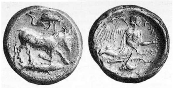 | SNG ANS 1235 | Katane, Sicily. ca 460 BC. AR Tetradrachm. River-god Amenanos as a man-headed bull kneeling right; fish below to right, branch above / KAT-ANE, Nike in long chiton and running left, holding a fillet in her right hand. SNG Cop 175. | Text | ![]() |