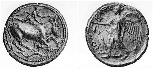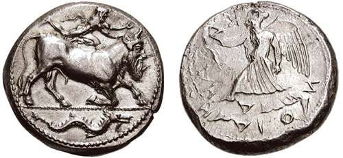| Randazzo 62 | Sicily, Katane AR Tetradrachm. ca 464-450 BC. River-god Amenanos as a man-headed bull kneeling right; above, Nike flying right; in exergue, ketos right / NOIHATAK(sic), Nike running left, in long chiton, holding a fillet in her right hand. | Text | ![]() |