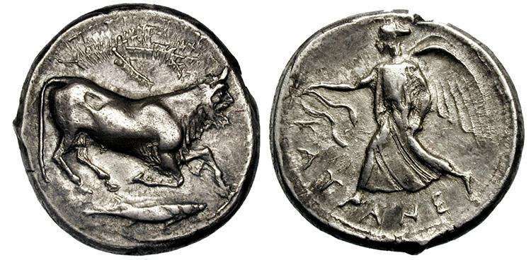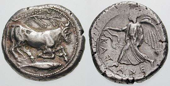 | Ludwig 322 | Katane Sicily, AR Tetradrachm. ca 460 BC. 25.8 mm, 16.84 g. River-god Amenanos as a man-headed bull kneeling right; crane above, fish below / KATANE, Nike flying right, holding a palm-branch in each hand, large murex-shell below. Rizzo (1946), 1 (this coin); Ludwig Coll. 322 (ditto). | Text | ![]() |