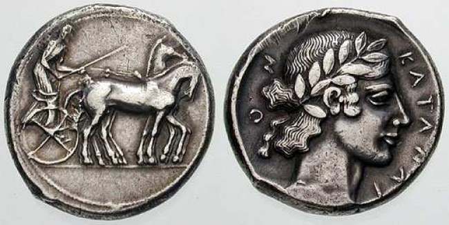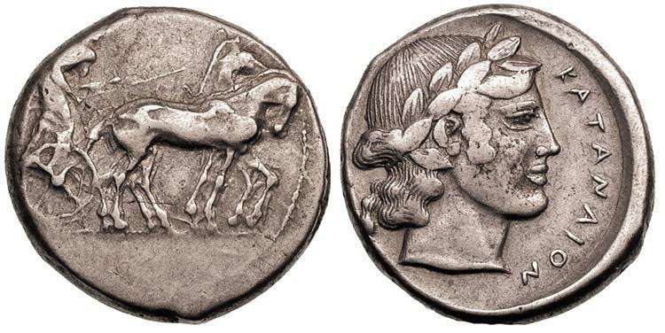| SNG ANS 1256 | Katane, Sicily. ca 435-425 BC. AR Tetradrachm. Charioteer driving racing quadriga right, holding long kentron in right hand, reins in left; Nike flying above placing a wreath on horses / KATANAION, laureate head of Apollo right; parsley leaf behind. | Text | ![]() |