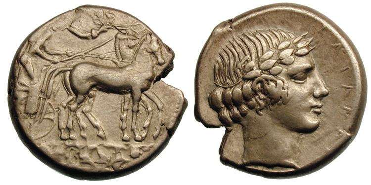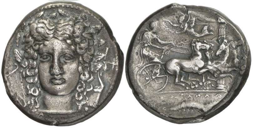 | BMC 34 | Katane, Sicily, AR tetradrachm, 405-404 BC. Artist Choirion. 26 mm. AΠOΛΛΩN beneath neck of laureate head of Apollo facing very slightly to left, strung bow in left field, lyre in right field, artist's name XOIΡIΩN to left of head / KATANAIΩN beneath charioteer, wearing a long chiton, driving a quadriga galloping right, rounding an Ionic column; Nike flying left above, crowning the charioteer; crayfish right in exergue. BMC 34; SNG ANS 1258; Hoover 575; Jameson 548; Gulbenkian 193. | Text | ![]() |