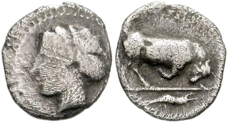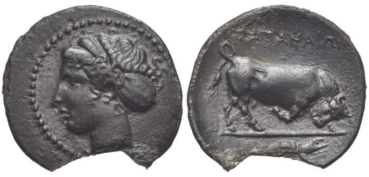 | SNG ANS 1270 | Katane, Sicily, AR litra, ca 405-402 BC. 11mm, 0.60 g. Head of a nymph left. / Bull butting right, shrimp right in exergue. SNG ANS 1270; Hoover HGC 591. | Text | ![]() |