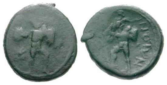 | Calciati 11 | Katane, Sicily. After 212 BC. AE 16mm. One of the Katanean brothers carrying his father right, serpent between legs; Π in right field / KATANAIΩN, the other brother carrying his mother right, serpent between his legs. BMC 74. | Text | ![]() |