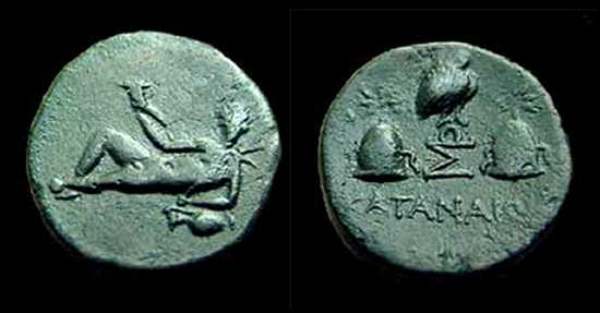 | Sear SG 1069 | Katane, Sicily, AE19. 2nd-1st century BC. River-god Amenanos reclining left, holding rhyton and resting arm on amphora / KATANAIΩN, owl standing right on ΩΣ monogram, between two caps of the Dioskuri. Calciati 8; BMC 56. | Text | ![]() |